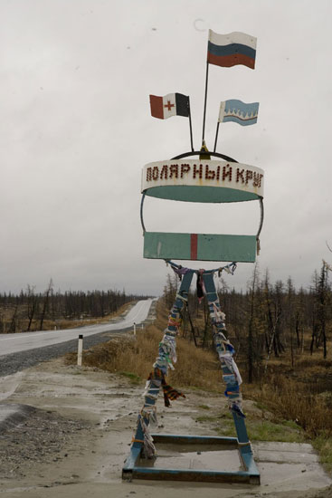 Знак полярный круг. Почему-то этот знак обвязывают ленточками и веревочками - подобный обычай есть у горных народов, правда они перевязывают обычно деревья у воды, на перевалах. Как бы в знак благодарности горным духам за хорошую дорогу. А здесь - такое смешение обычаев.