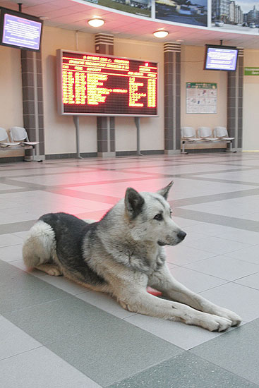Фото: аэропорт. Салехард.Собака возле табло в аэропорту Салехарда - это не прикол. Такое впечатление, что она тоже ждала рейса и ранние пассажиры, летящие в Москву, ее совершенно не напрягали. А вообще, аэропорт в Салехарде очень симпатичный.