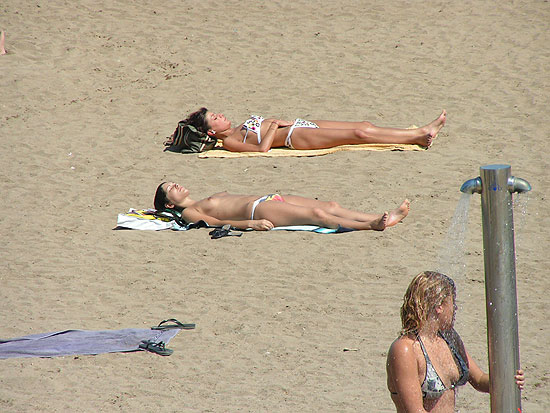 На одном из пляжей Барселоны. Обнаженные тетки. Практически ню. Но в принципе и у нас в России или на тех же украинских крымских пляжах и не такое увидишь.