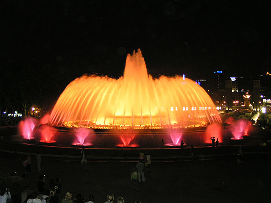 Фото: Барселона.Освещение фонтана ночью придает ему фантастические краски и формы. Сами фонтаны называют поющими - по субботам там устраивают целое шоу. Фонтаны меняют свет подсветки и форму потока. Все происходит под испанскую музыку. В обычный день - это просто фонтан.