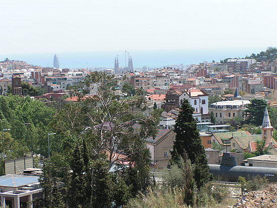 Вид на город Барселона сверху, с горы под названием Tibidabo. Где-то вдали виднеется море.