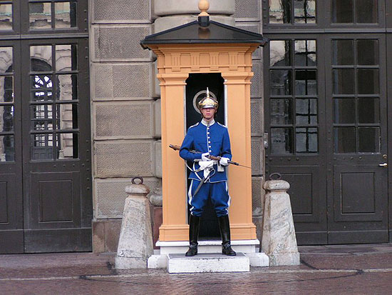 Охранник - он и в Швеции охранник. Суровое выражение лица, оружие в руках - олицетворение "силы" и "порядка".