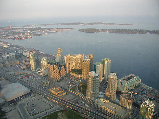 Вид на Торонто и озеро Онтарио с башни CN Tower.